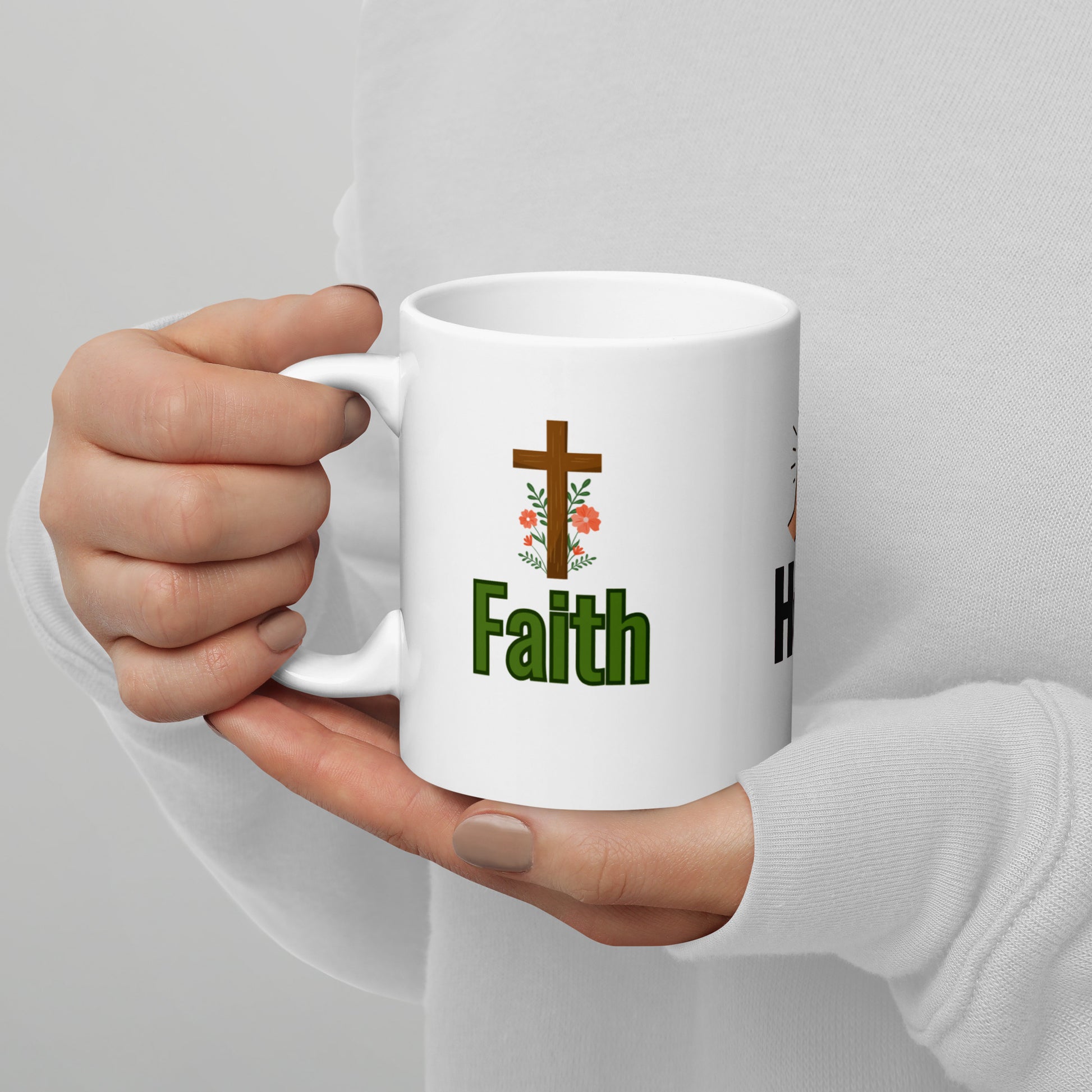 Each side of the mug highlights one of these enduring truths: Faith with a cross and flowers symbolizing life in Christ, Hope with praying hands representing trust and perseverance, and Love with a bold red heart, the greatest gift of all.