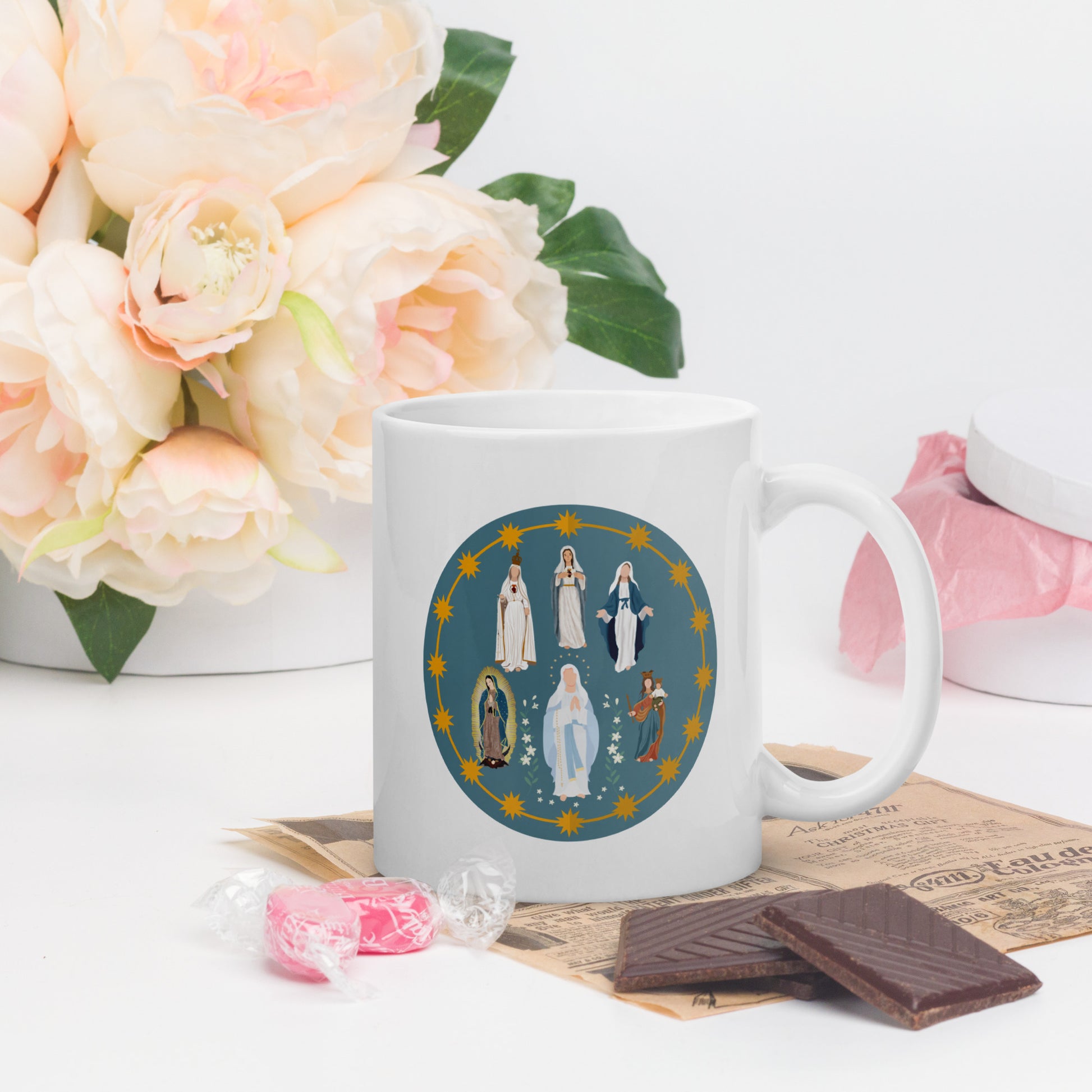Honor the beauty and devotion of the Blessed Mother with the Mother Mary mug. This elegant white ceramic mug features a circular design showcasing beloved Marian apparitions, including Our Lady of Guadalupe, Our Lady of Lourdes, Our Lady of Fatima, and more, surrounded by golden stars on a soft blue background. A perfect blend of faith and artistry, this mug brings inspiration and peace to every sip - ideal for morning coffee, tea, or quiet prayer time.